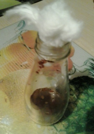 その後蓋をとって、綿を瓶の口に詰め込みます。